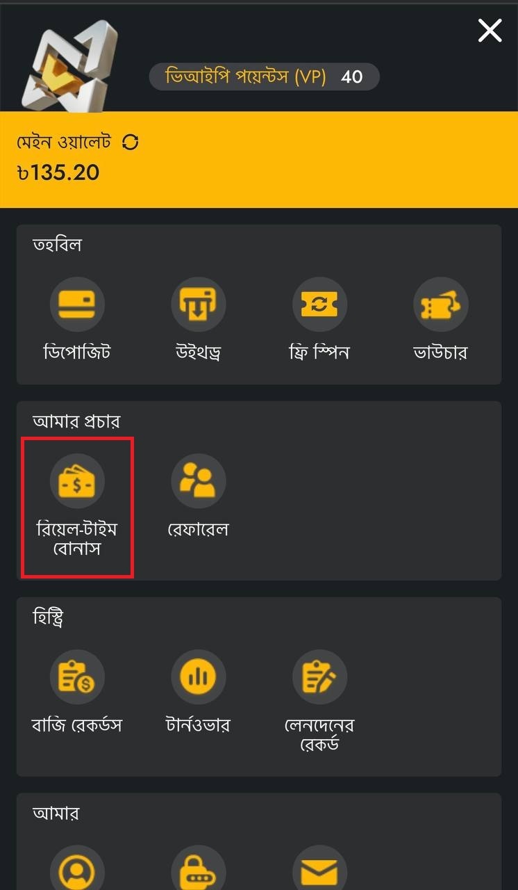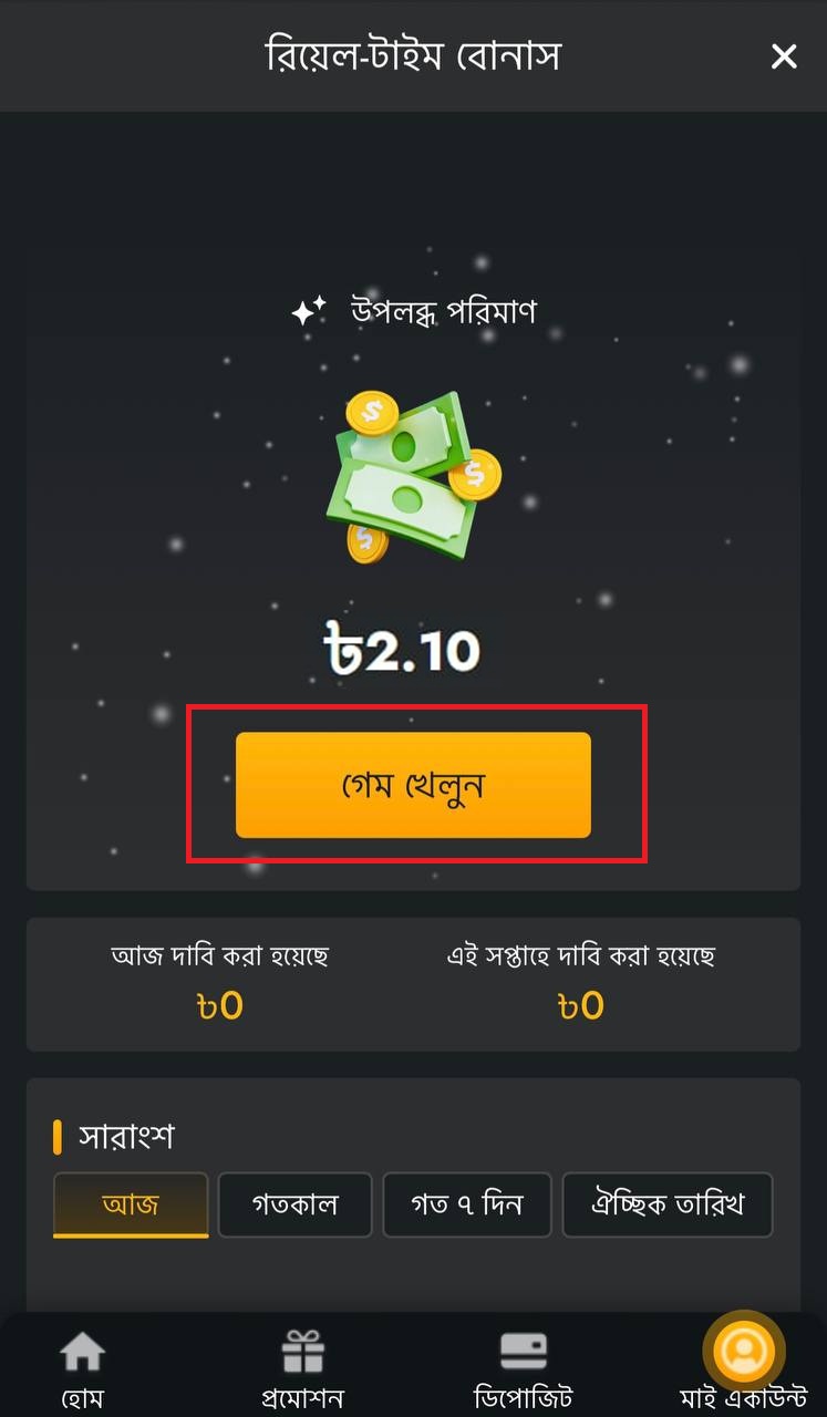 ৩. মেইন ওয়ালেট ট্যাবে ক্লিক করুন এবং Real-Time Bonus আইকন খুঁজে বের করে সেটিতে ক্লিক করুন। এগিয়ে যেতে ক্লিক করুন।