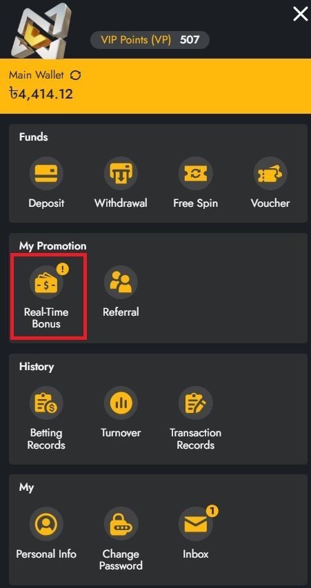 3. Click the main wallet tab and look for Real-Time Bonus Icon. Click to proceed.