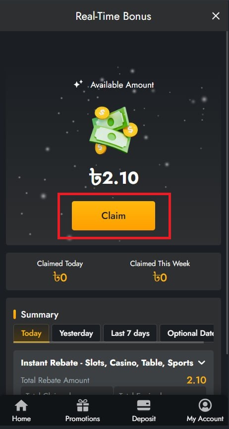 4. Click Claim under Available Amount in the Rebate or Rescue Bonus tab to redeem your bonus.